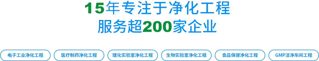 更多+15年专注于:电子工业厂房、生物制药、理化实验室、生物实验室、GMP车间、医院手术室、、医疗器械车间、动物房、食品加工车间、化妆品车间等诸多净化行业领域。立志为净化行业前沿技术引领。
